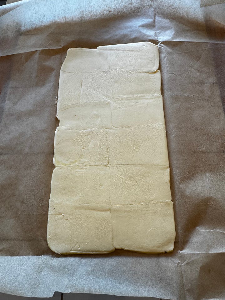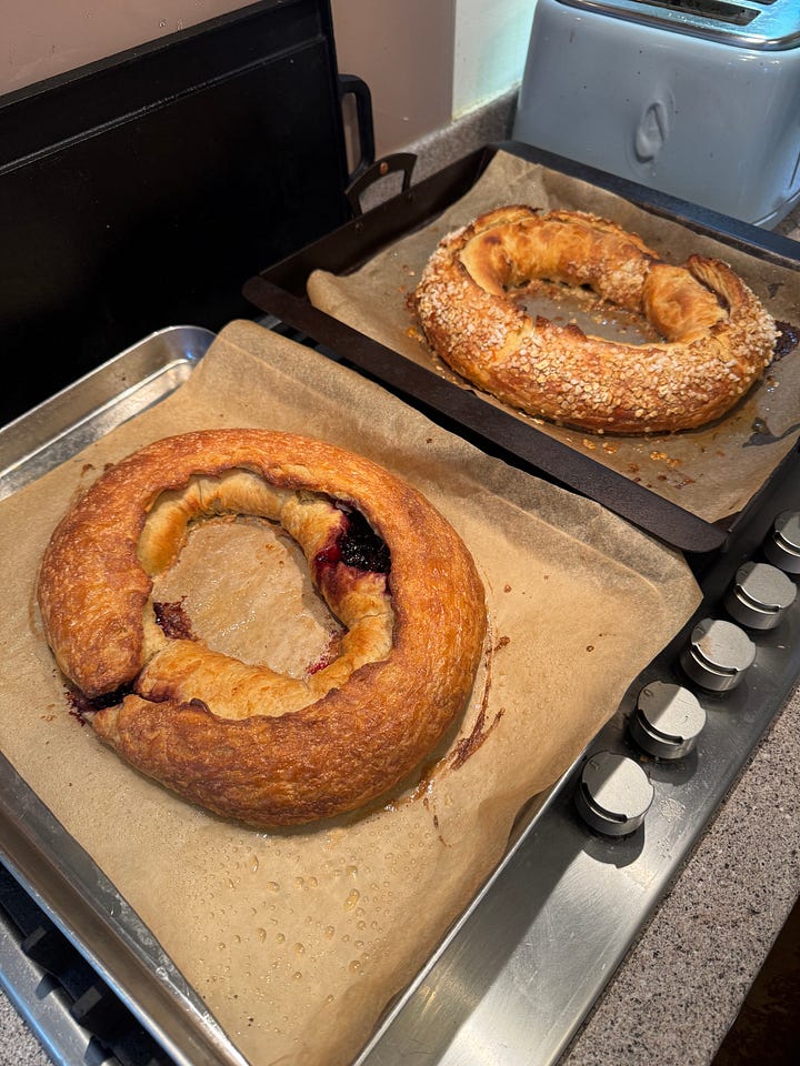 I went back through my files and found the first kringle recipe I ever wrote down, which was in January 2013. If memory serves, it was based on the only recipe I could find at the time, which is a good one – straight from O&H, Wisconsin’s second-best kringle bakery. Over the years, kringle R&D has taken me on some interesting detours, through Shauna Sever’s very good “shortcut” version and some successful-ish vegan iterations to accommodate my son’s milk and egg allergies. But over time, I’ve come full circle back to laminated dough made with real butter – it just gives the best results (and Felix can now eat cooked milk, so there’s no need for me to mess around with margarine). This is all to say that developing a kringle recipe I’m happy with has been a years-long, ongoing process, and even in the few weeks since I drafted the Guardian recipe, I’ve made some significant tweaks. That version was mk. IV; what follows is mk. IX.