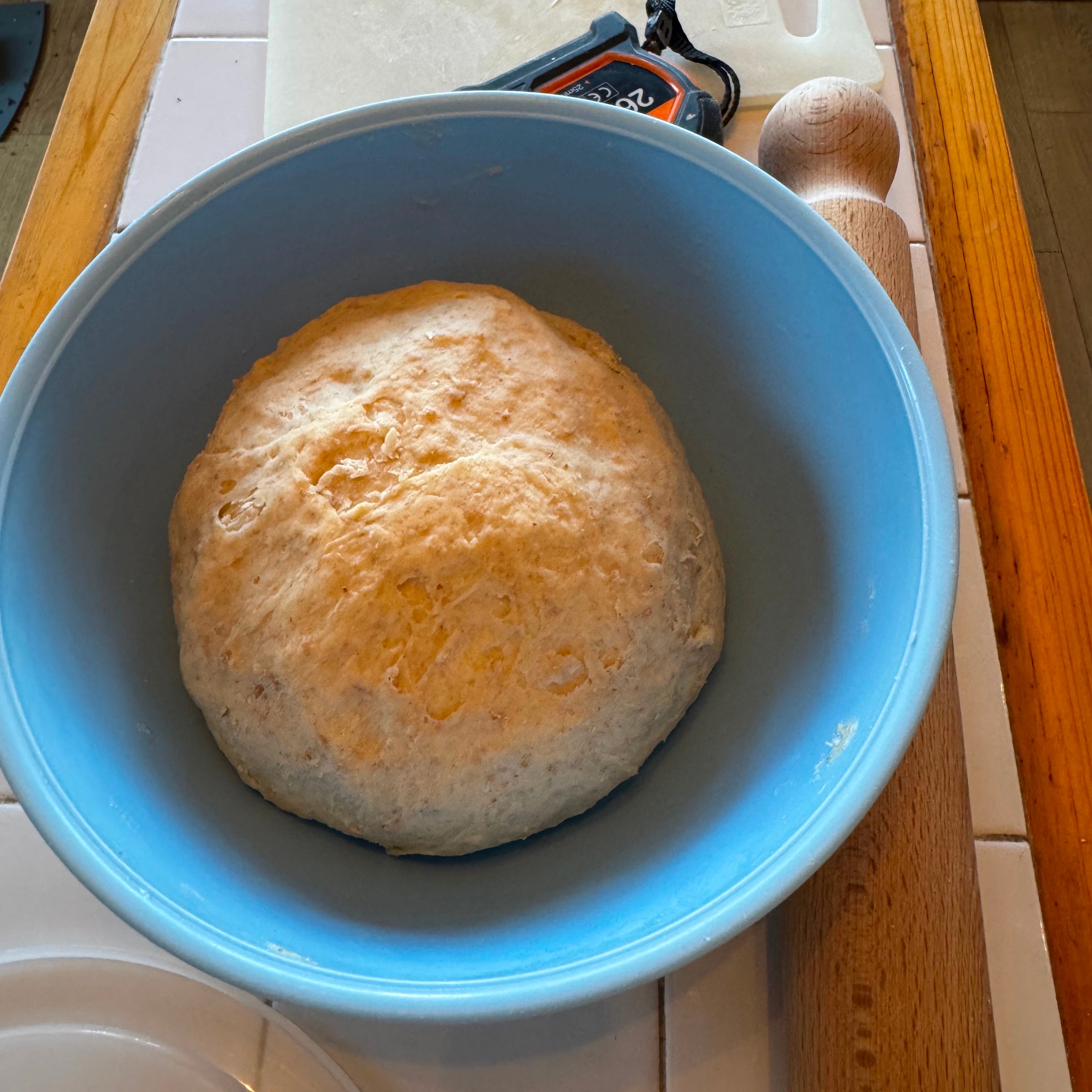 Tip the flour into the milk mixture, then mix with a spatula or wooden spoon until the dough comes together – it will be shaggy and sticky at first. Knead the dough in the bowl until it has an even consistency, without any floury or wet patches. It’s okay if the dough looks a little rough – it will not feel smooth until it rests and fully hydrates. Leave the dough in the bowl, loosely covered, to prove for one hour.