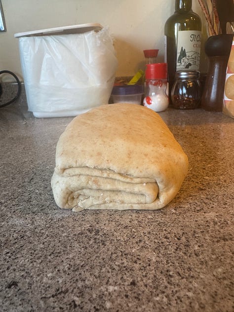 It is important that the butter doesn’t get too warm during lamination; this will cause it to be smushed into the dough, rather than staying separate in distinct layers. However, if the butter is too cold, it can be hard to roll out, and may tear the dough. You will be able to see and feel how the butter is behaving as you roll it, especially as the dough becomes translucent. If the butter is too firm, and starts to break into chunks or poke through the dough, let it sit at room temperature for 10 minutes to warm up. If the butter is too soft and you notice the dough is becoming greasy, put it back in the fridge for 20 mintues or so until it is well chilled. You may have to play around with these timings, especially as active fermentation generates heat, so it can make the butter soft even when it’s in the fridge. I have found 30 minutes between rolls to be a good ‘sweet spot’ where the butter is pliable but not soft, but of course this all depends on the temperature of your fridge, your kitchen, and the dough itself.