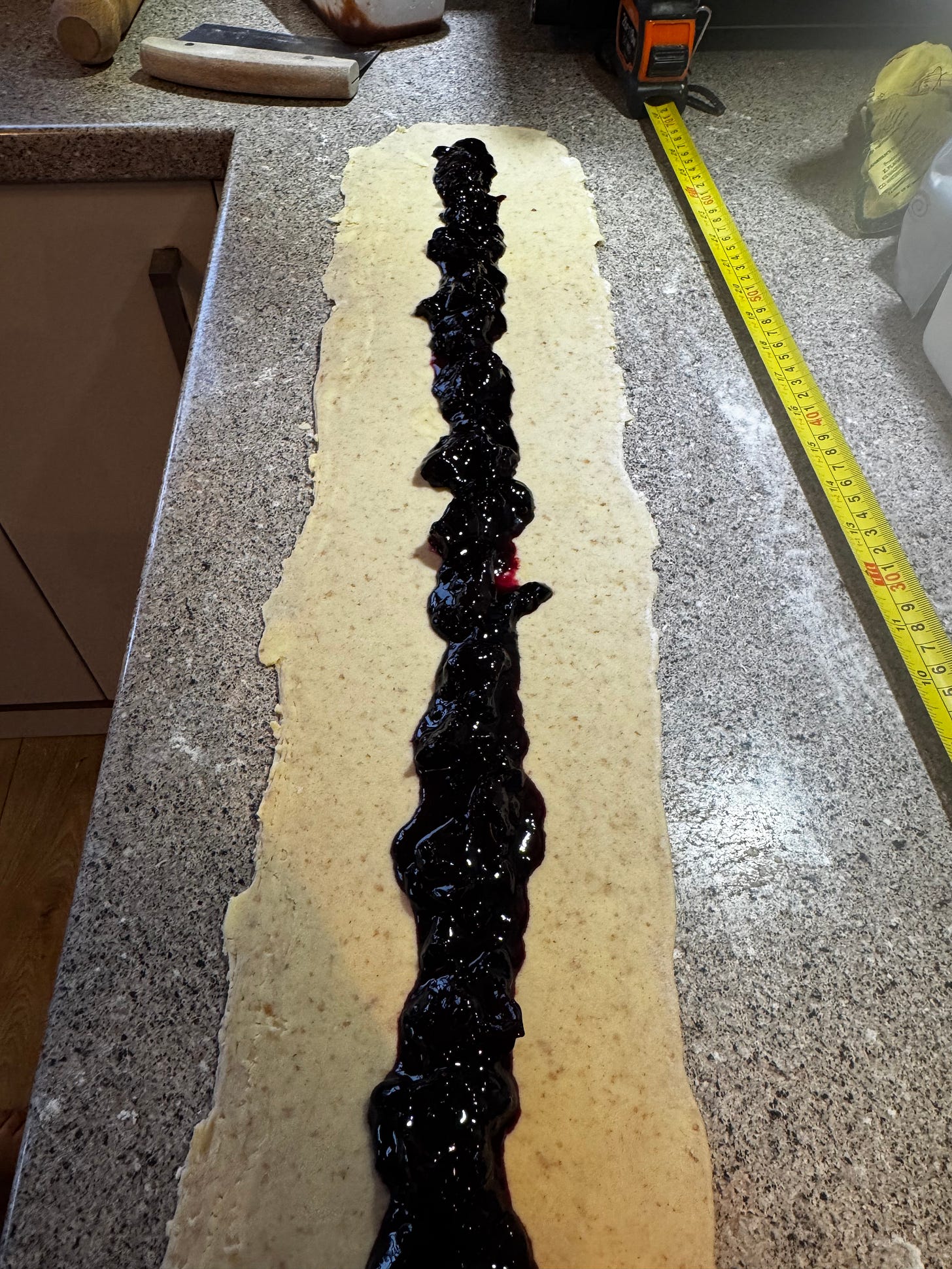 Spoon the filling of your choice (jam, compote, nut paste, etc. – see notes, below) in a line down the centre of each strip of dough. You will need about 120g of filling per kringle, so 240g total.