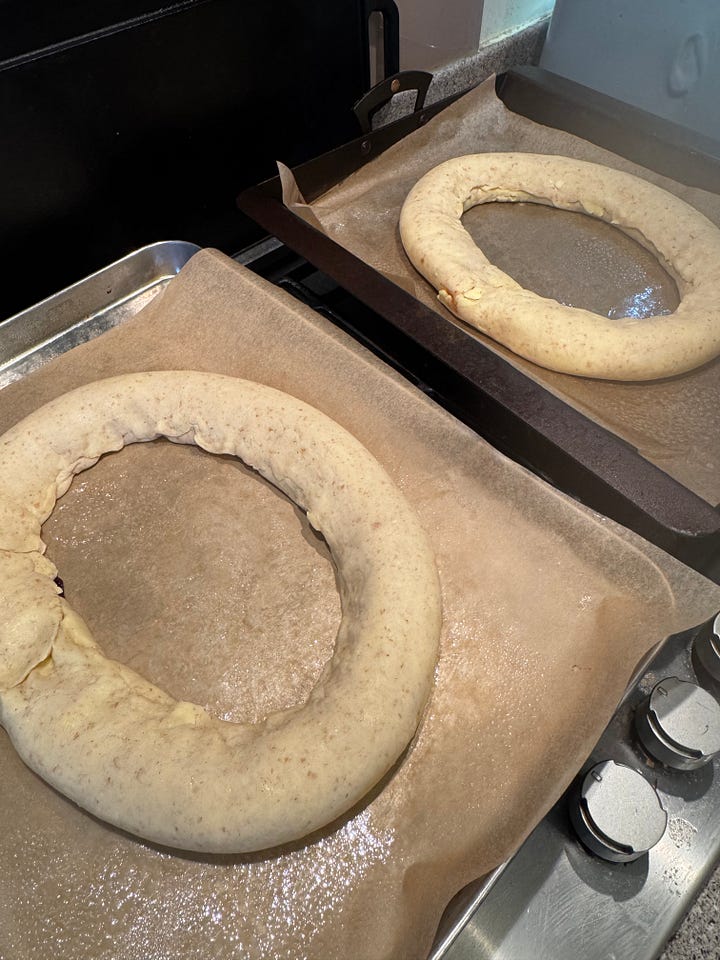 Curl the tube of dough into a ring, tucking one end into the other. Carefully transfer the rings to the prepared trays. Brush of each kringle with cream (or beaten egg), ensuring that the entire surface is well-coated, including the sides.